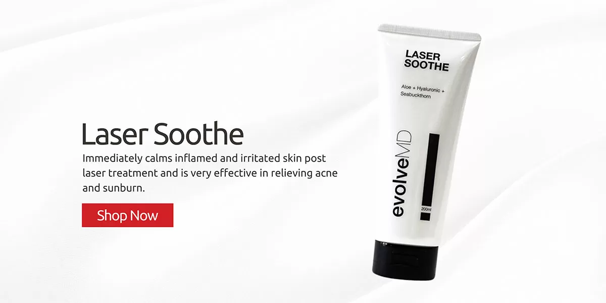 To help soothe and protect your skin, we recommend using our evolveMD Laser Soothe gel. This specially formulated gel immediately calms inflamed and irritated skin, providing quick relief post-laser treatment. It’s also highly effective in relieving acne and sunburn, making it a versatile addition to your skincare routine.